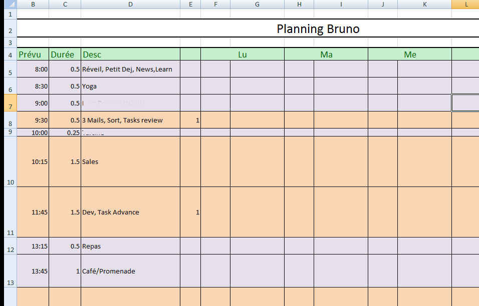 I didn’t place numbers. It allows a flexible day and invites for more comments. I don’t write time spent precisely. I’m often multitasking so time spent is not very significant. Previous iteration was very strict on time, I could follow it only during a few weeks[/caption]