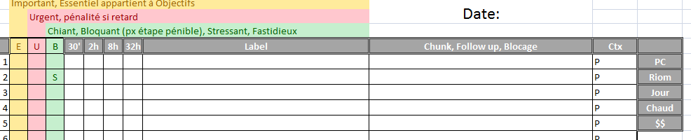 I will color the day when I review days or weeks productivity. It can be days after. A color for “on the money” (marketing, writing and promoting), a color for “background work”, a color for user visible enhancements. At the end of the month, I can have an instant view of how it went by looking at color patterns. If days are of a single color for weeks it’s not good. If there is a dominant color is not good either. It should be a balance of good patches of colors spread across the week. I count from the time I open my eyes to the time I stop. I have a continuous note taking habit. Digital notes will carry the time and can be viewed as a long journal. I wrote a small app that collects automatically what I’m on. Every month I run another small app analyze this log. I’m not monitoring on a daily basis. When I compare my coloring and my tracking I can fine tune my rules of thumb. For example I always thought that I was working 16h a day, it’s wrong: I hardly work more than 9 hours :) An older iteration of my planning, more GTD inspired[/caption]